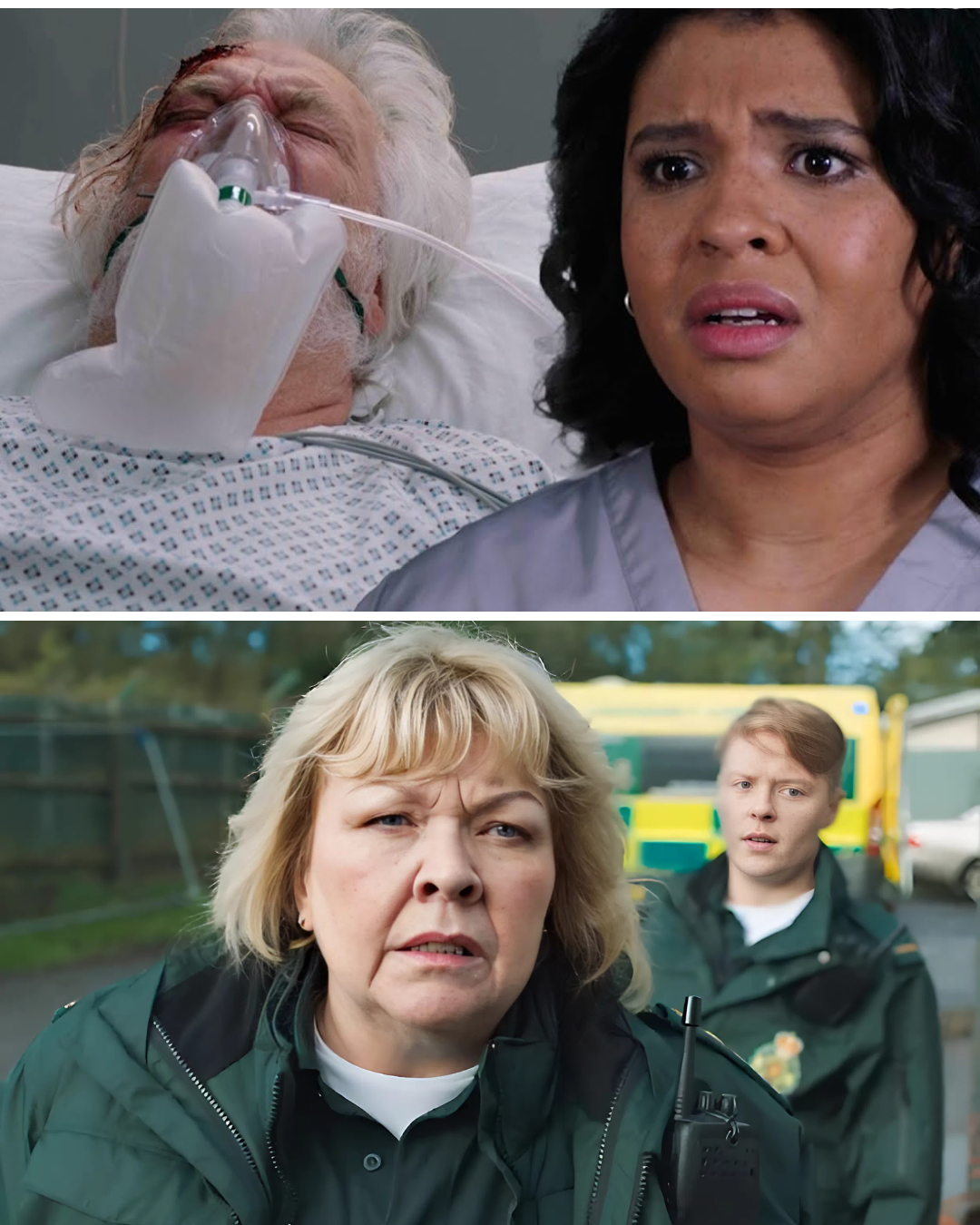In one of the episode’s most visceral scenes, 65-year-old Terry Melville, a driver caught up in the ordeal, is violently attacked. He is dragged 100 meters along the road in a brutal ambush orchestrated by the same gang manipulating Sunny. The sequence—filmed with a shaky, documentary-style urgency—captures the chaos of the ED receiving the pre-alert about one of their own being rushed in as a trauma patient.