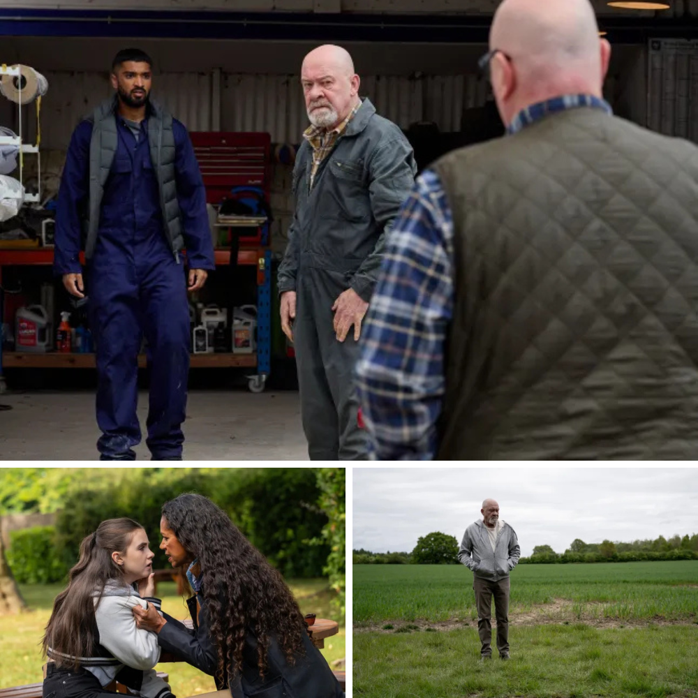 Bear Wolf being confronted by Paddy Kirk in Emmerdale, with Kammy Hadiq standing behind him.