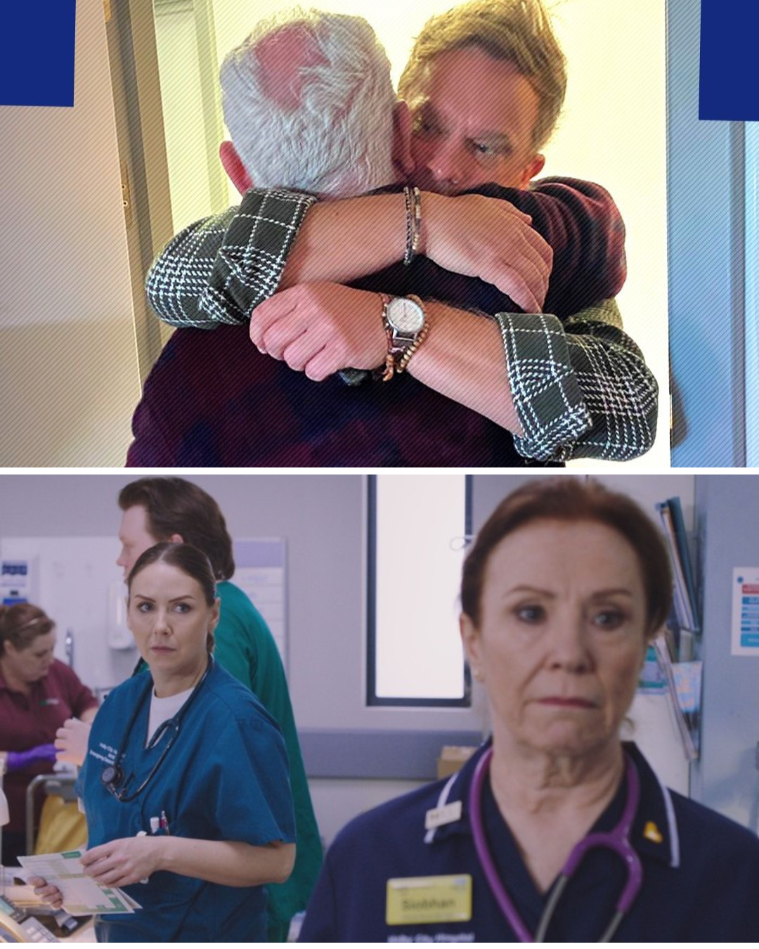 Elinor Lawless as Stevie and Melanie Hill as Siobhan in Casualty. BBC Studios